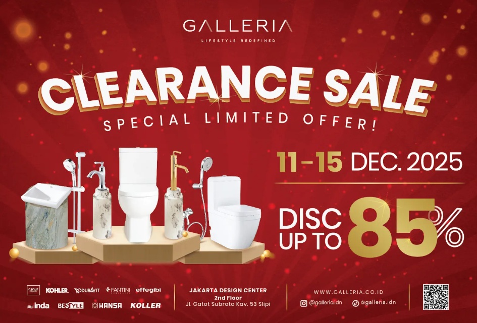 Galleria Clearance Sale – Special Limited Offer kembali hadir dengan diskon terbesar yang pernah ada, menawarkan koleksi sanitary, faucet, dan perlengkapan wellness premium dengan potongan harga HINGGA 85%!