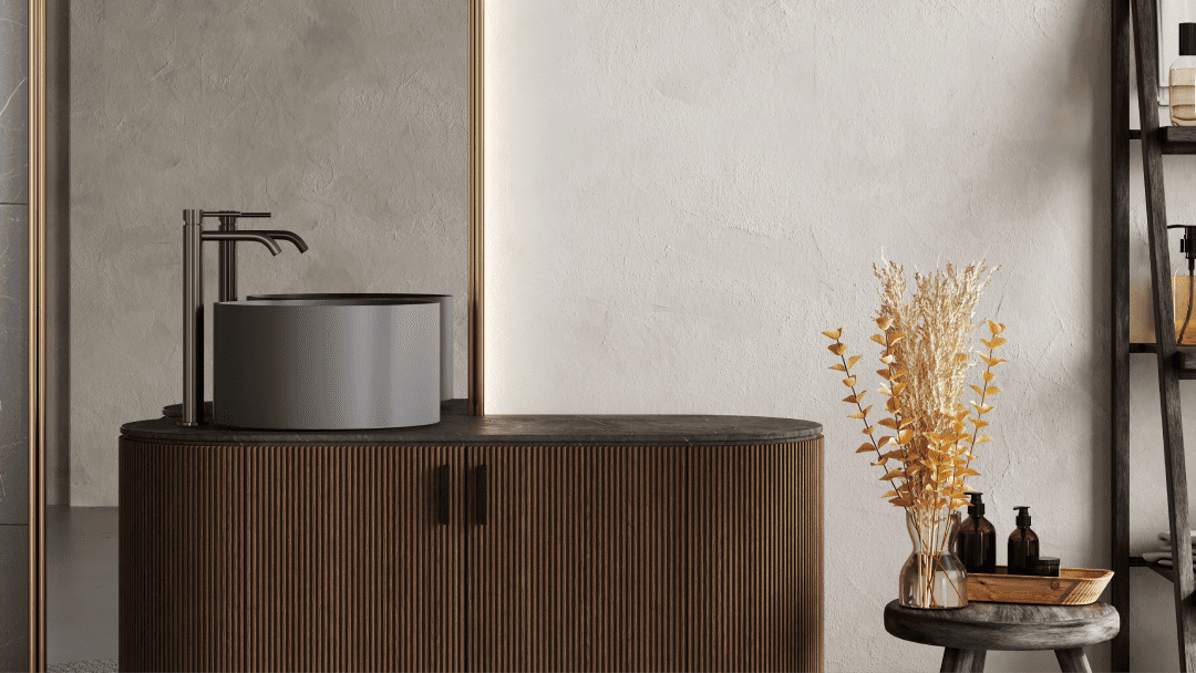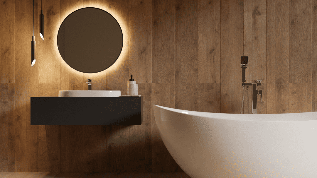 Jika Anda ingin memberikan sentuhan hangat dan alami pada kamar mandi, kayu bisa menjadi pilihan yang tepat. Kayu tahan air seperti teak sering digunakan untuk meja wastafel, rak, atau lantai. Penggunaan kayu memberikan nuansa spa yang nyaman dan menghadirkan elemen alam ke dalam kamar mandi.