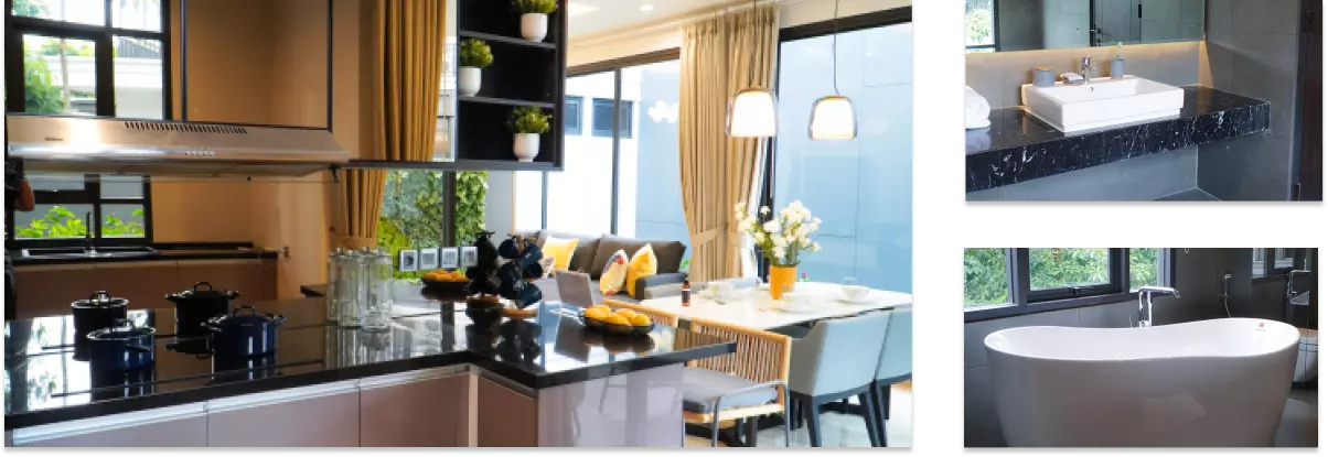 Pilihan furniture dengan desain simpel, elegan dan minimalis yang dapat memberikan kesan modern dan nyaman pada ruangan. Hal tersebut juga berlaku dalam pemilihan sanitary fixture. Ruangan yang memiliki material dari bahan marmer atau granit akan menjadi fokus utama suatu ruangan karena menghadirkan ketenangan dan kesan ekslusif.