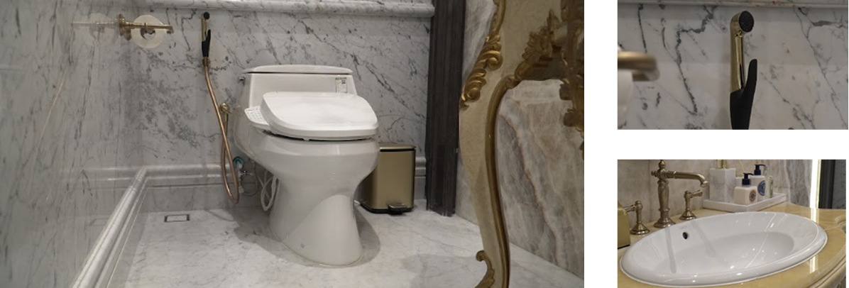 Hadirnya bathtub Kolpa Nabucco memberikan sentuhan kemewahan spa pribadi, sementara faucet Grohe Essence dan Grohe Allure melengkapinya dengan desain minimalis yang menawan. Perpaduan closet timeless seperti Kohler San Raphael dengan wastafel modern Kohler Forefront dan Carillon menciptakan harmoni desain yang sempurna. Bahkan detail kecil seperti floor drain Bestyle conceal tile dipilih untuk memastikan tampilan lantai yang mulus dan estetis.