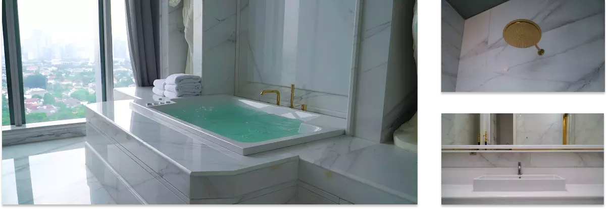 Hasil akhir terlihat sangat mewah. Pemilihan produk terlihat serasi dan presisi walaupun dari beragam brand berbeda. Produk dari brand yang berbeda-beda memang seringkali menimbulkan kekhawatiran tersendiri. Terutama dari segi warna, model, ukuran, dan teknologi fungsi. Untuk mendapatkan kombinasi terbaik, pastikan Anda berkonsultasi dengan team ahli berpengalaman Galleria. Pastikan kamar mandi nyaman untuk penggunaan jangka panjang.