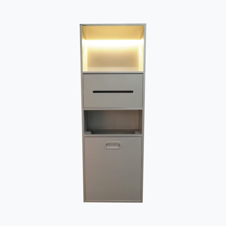 - Material Kokoh: Menggunakan bahan seperti stainless steel, aluminium anodized, dan kaca tempered yang tahan korosi dan mudah dibersihkan.