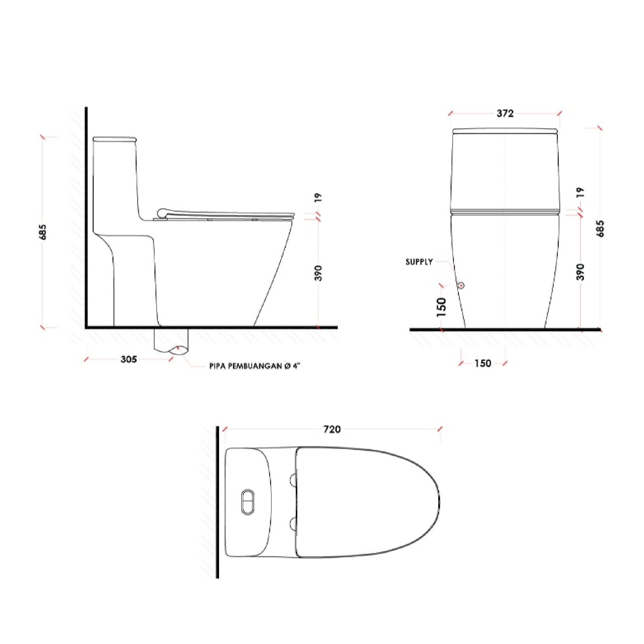 - One-Piece Toilet, BAULINES, with Soft Close Seat Cover Rough-in: 305 mm. SKU: PK-39992000