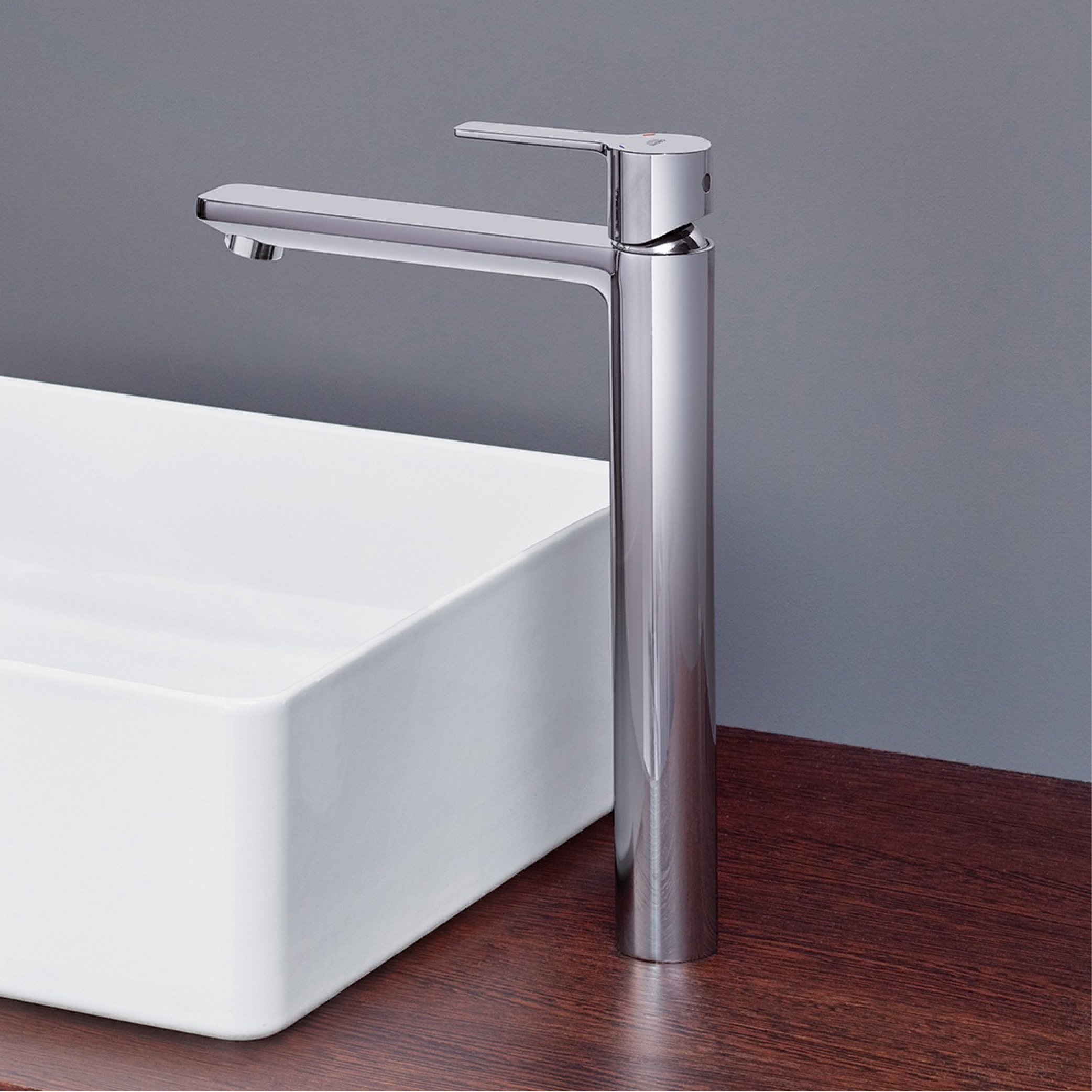 With its tall and elegant cylindrical body and crisp rectangular handle and spout the GROHE Lineare single-lever basin mixer goes perfectly