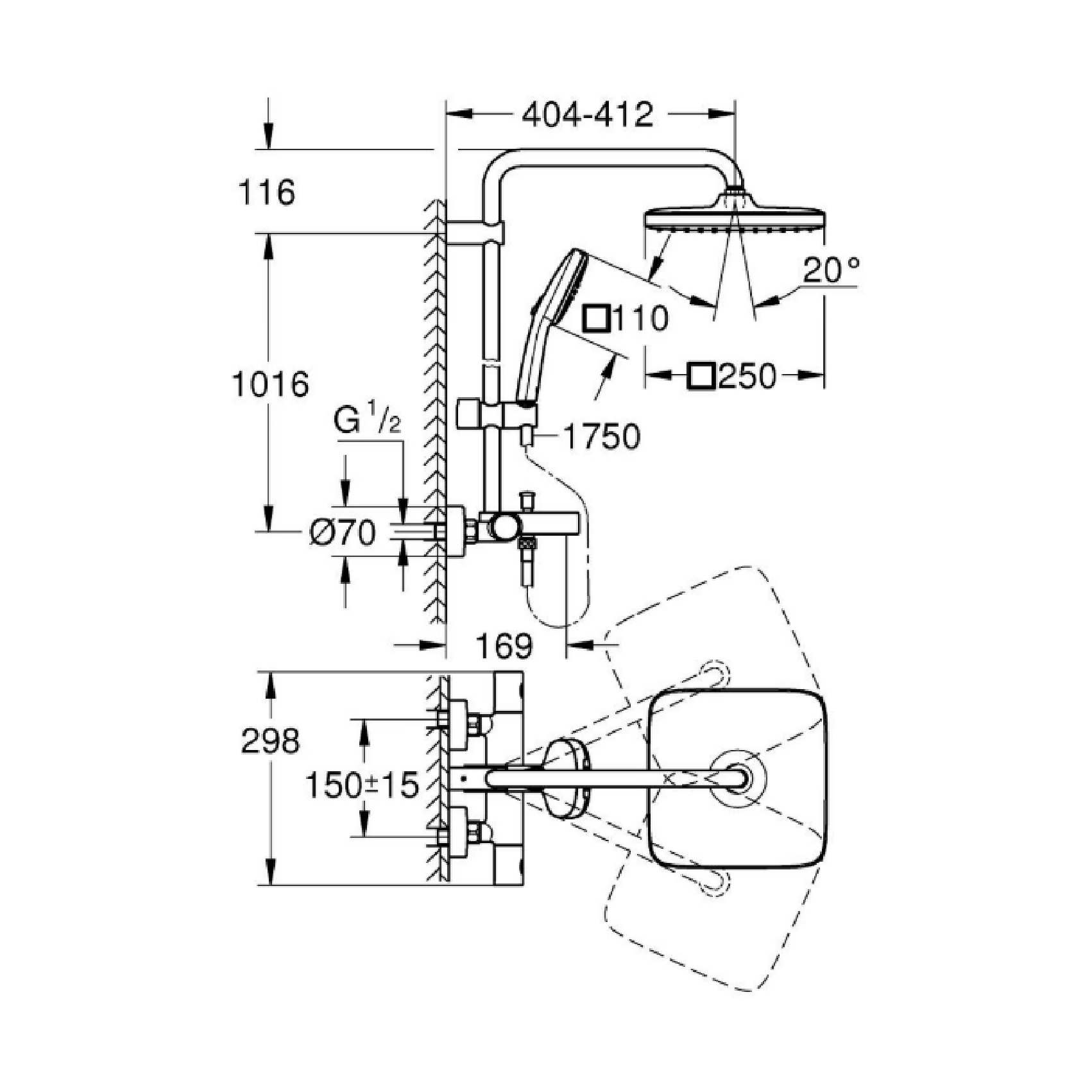 The exposed system for wall-mounting consists of a 250x250mm head shower, a 110x110mm hand shower, bath thermostat, shower rail with 390mm swivel-action shower arm and gliding element to adjust the hand shower, plus a 1750mm hose with TwistStop function. The head shower offers a gentle, relaxing Rain Spray. The hand shower comes with a ShockProof silicone ring to protect it against drops or knocks. It has 2 spray patterns, the soft Rain and the powerful, targeted Jet Spray. Both are easy to access using the innovative GROHE SmartSwitch diverter on the back of the shower head.