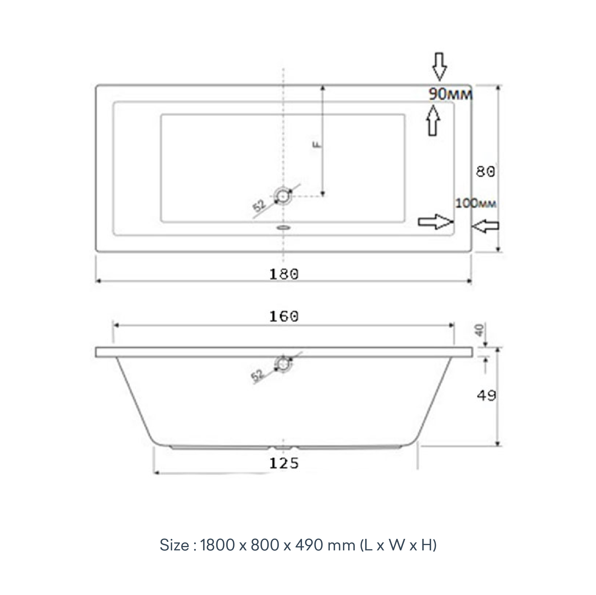 KNIEF BUILT-IN TUB 180X80CM + BATH TRAP INCLUDE OVERFLOW 1M