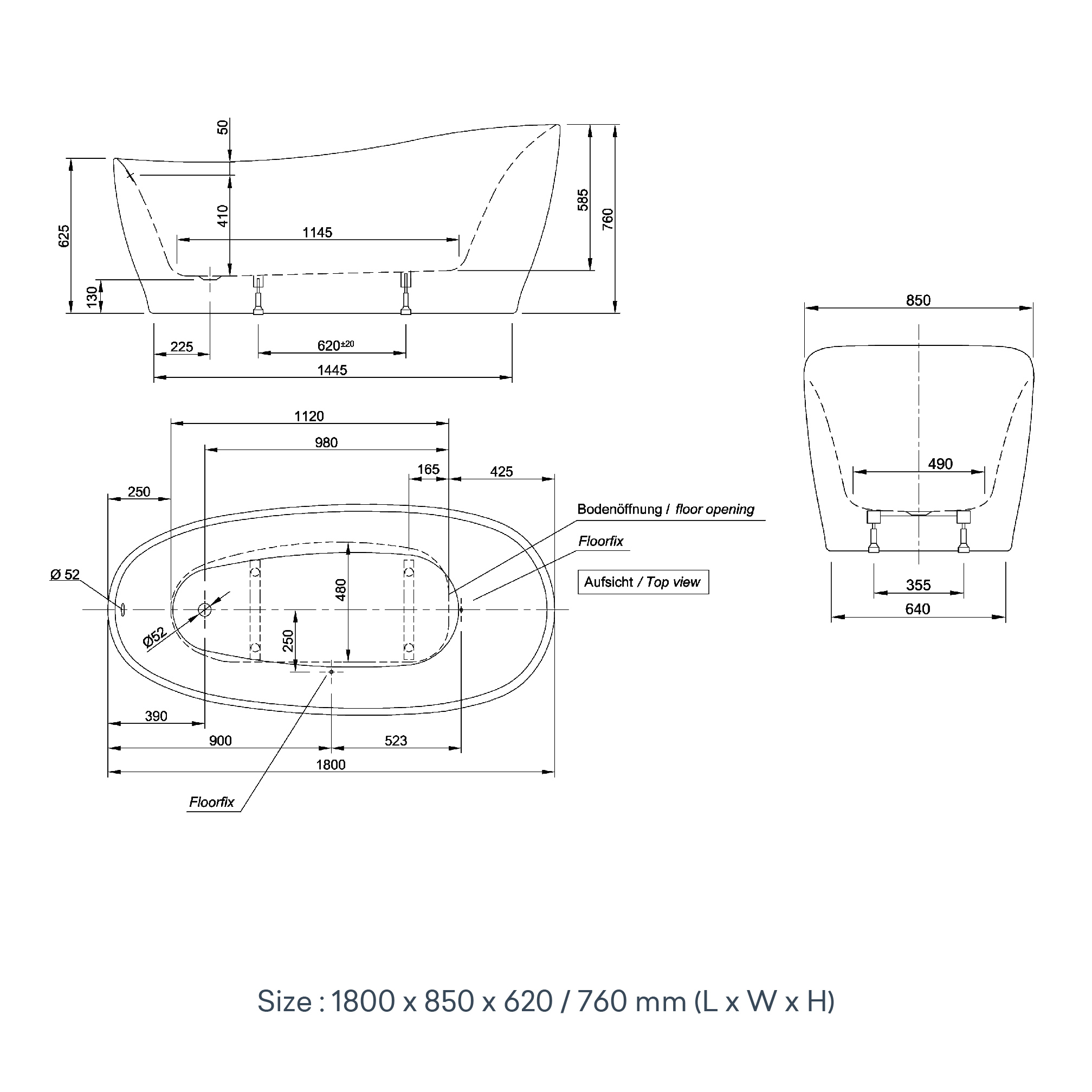 • Dimensions: 1800 x 850 x 625 / 760 mm (L x W x H)