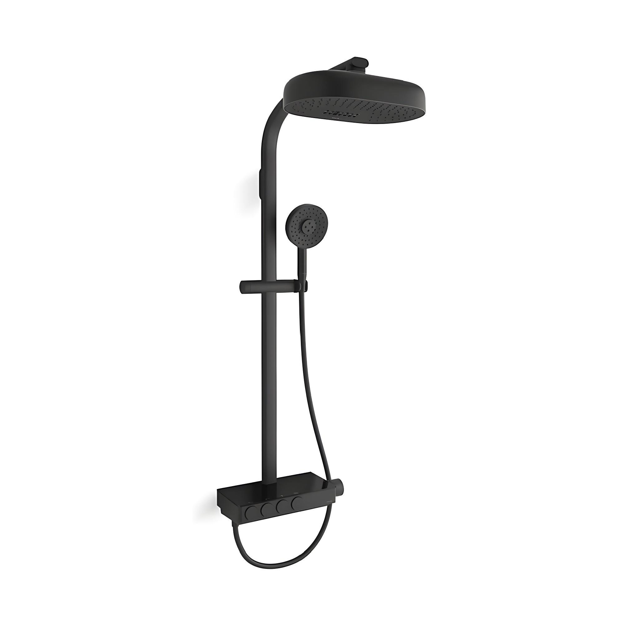 Create an elegant, spa-like showering experience with luxurious multifunction rainhead and handshower versatility in the thermostatic bath/shower column. Influenced by iconic design, the system features a built-in shelf storage, intuitive push button and dial controls, and integrated thermostatic valve/control panel.