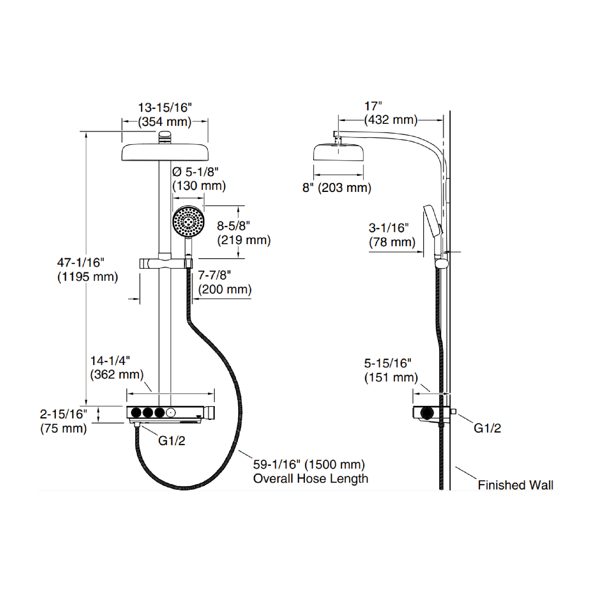 • Includes bath/shower column, multifunction rainhead, handshower, hose, thermostatic valve and control panel with integrated bath filler.