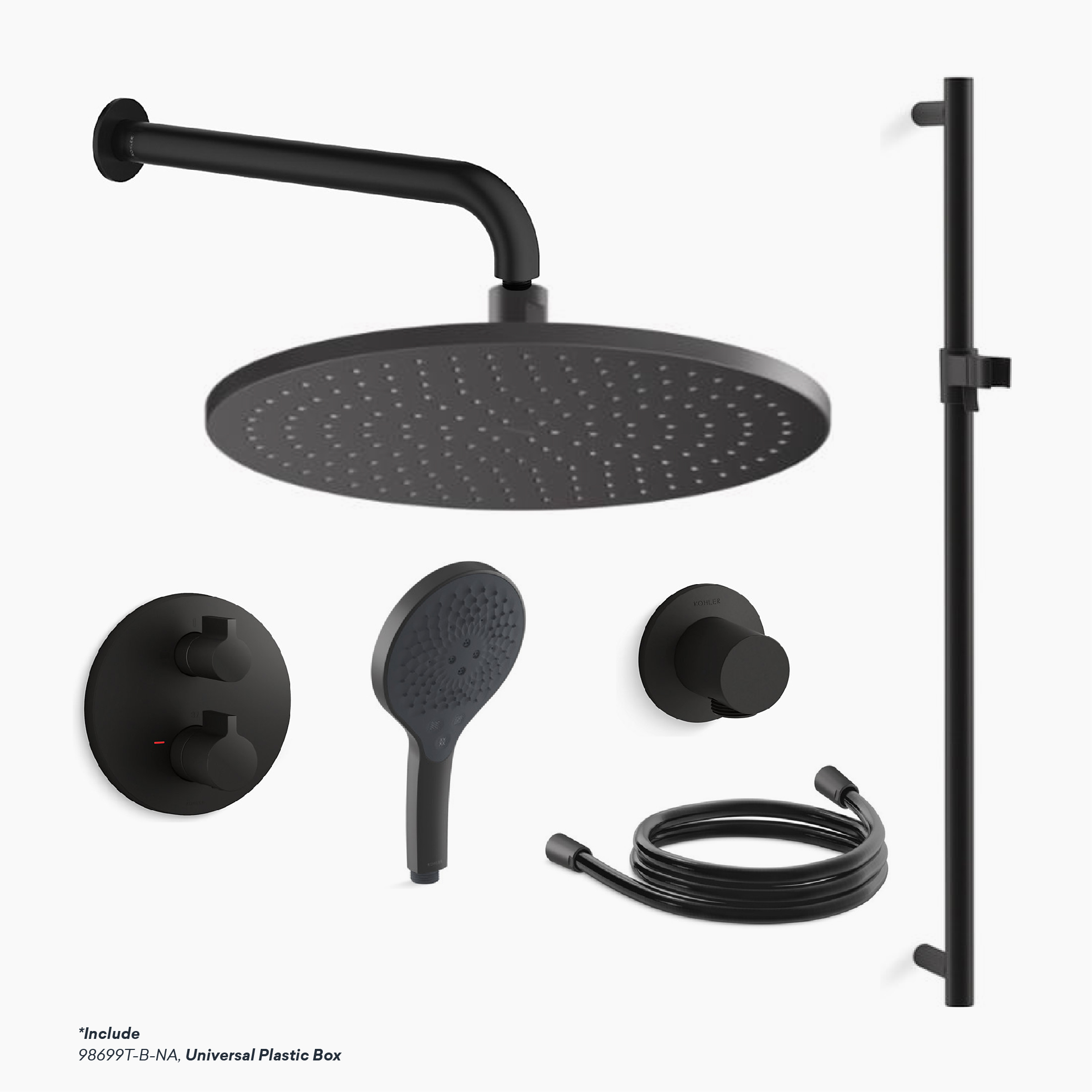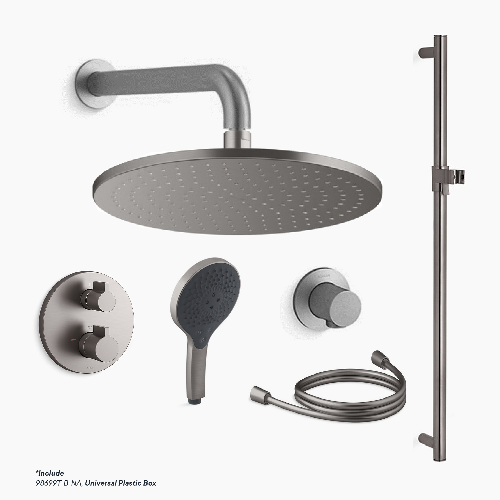 • 10″ Contemporary Round Katalyst Air Showerhead. SKU: K-33412T-CP/BL/2MB/RGD/BN/AF/BRD/BRT